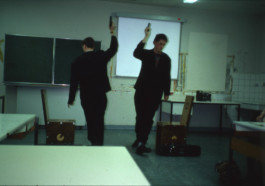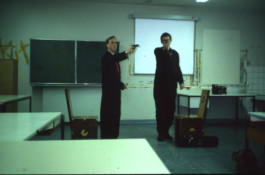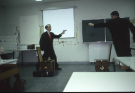 Repeatedly performed by us: the Frankfurter Bankstuhlgang Performance - a personalised shootout of the financial industry with verbal accompaniment - read by the lottery fairy Ingrid El Sigai. (Here with pictures showing a performance that took place about 30 years ago but has lost none of its relevance). On seemingly massive chairs held together by oversized screws, the protagonists sit on the logo inlays of the most important German financial institutions and compete against each other as duelists, again and again, caught in a competitive mantra.