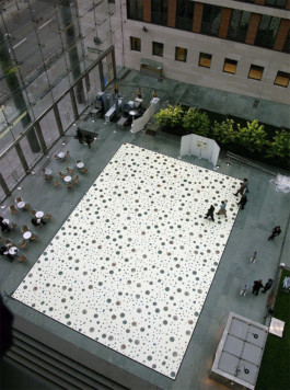 For this purpose, Peter Zizka has created the floor installation "The Virtual Minefield", which shows photographically accurate images of mines. Whoever walks over it will enjoy the bizarre beauty inherent in the pattern of diverse shapes and materials. Only at second glance does the horrible object reveal itself.